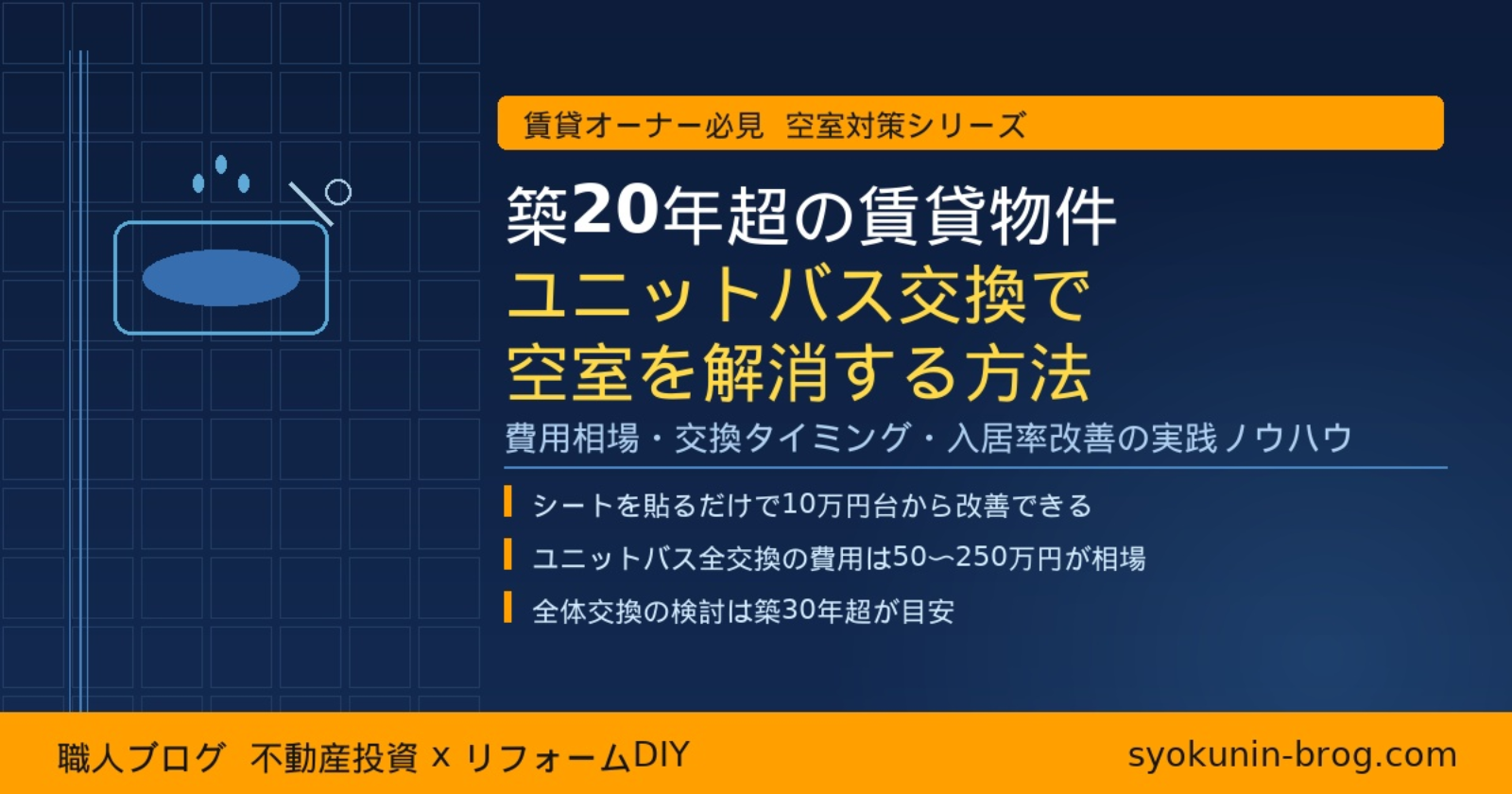 ユニットバスの対策は、いきなり高額な全体交換が正解とは限りません。築30年未満であればリフォームシートで10〜20万円の投資でも入居率は大幅に改善できます。築30年超で劣化が進んでいる場合は、全体交換50〜250万円の範囲で検討を。大切なのは、「今の状態に合った適切な対処」を選ぶことです。